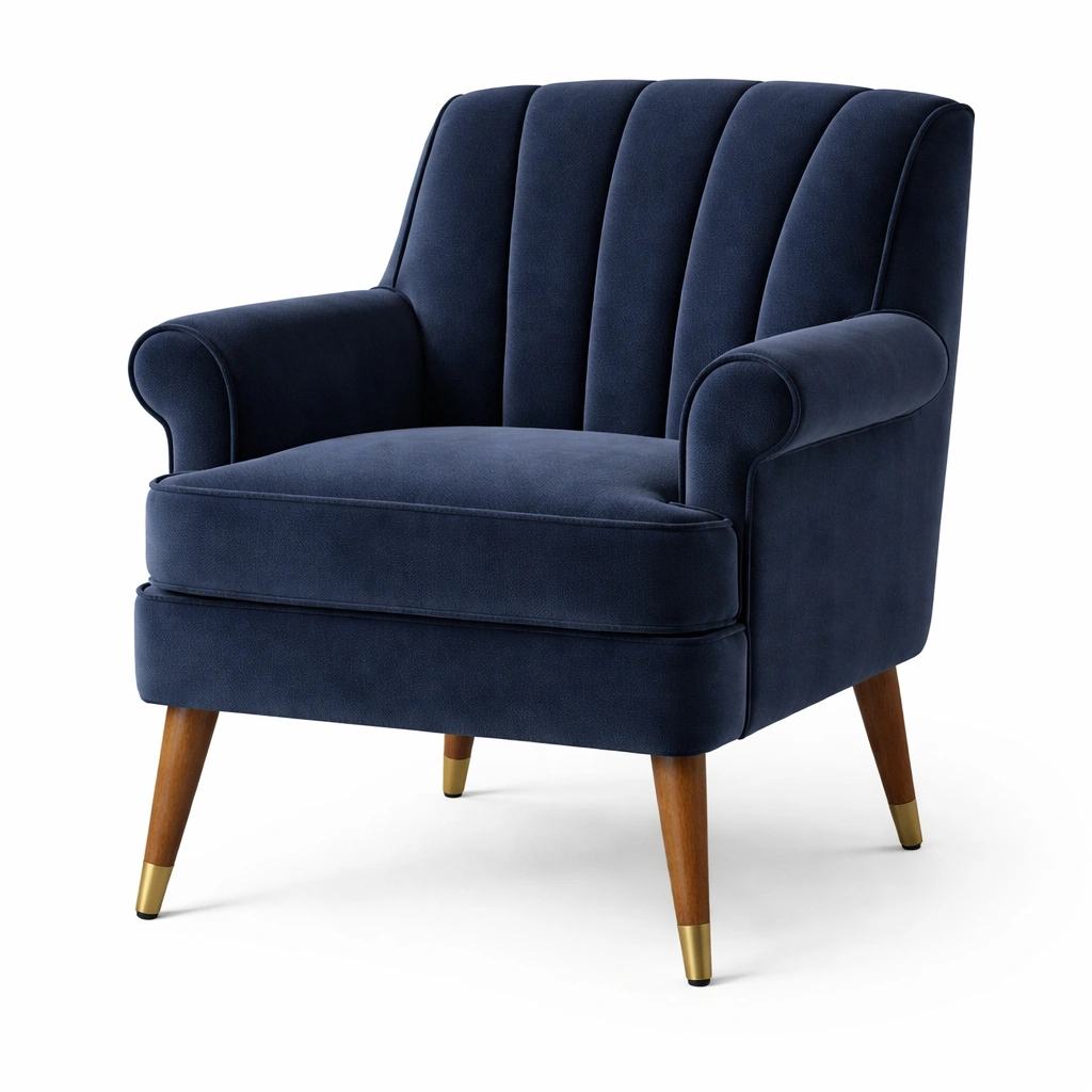 Sillón de terciopelo azul oscuro con patas de madera y detalles metálicos