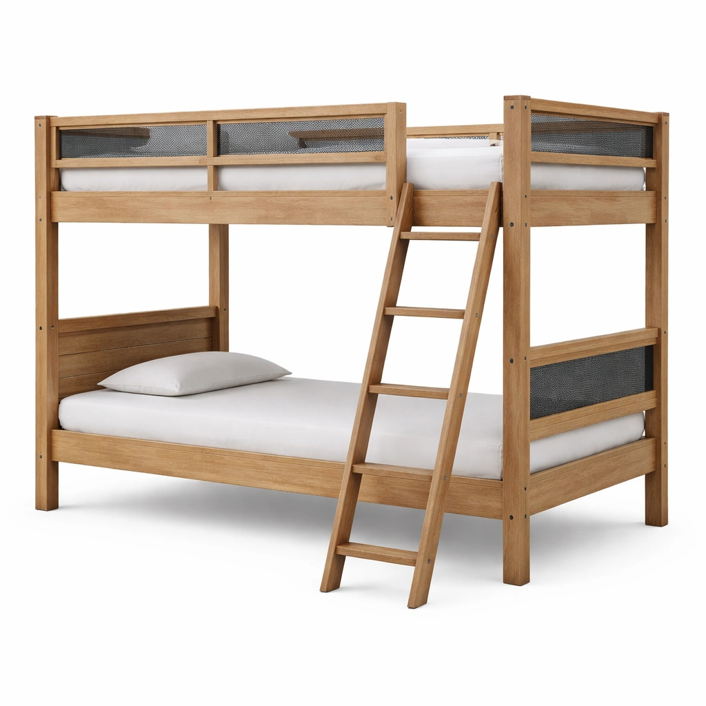 Estructura de madera de roble con barandillas de malla de acero. Dimensiones: 200 cm de largo, 90 cm de ancho, 160 cm de alto. Peso: 75 kg. Edad recomendada: 6 años en adelante. Capacidad de carga máxima: 100 kg por cama. Requiere montaje. Limpieza con paño húmedo.