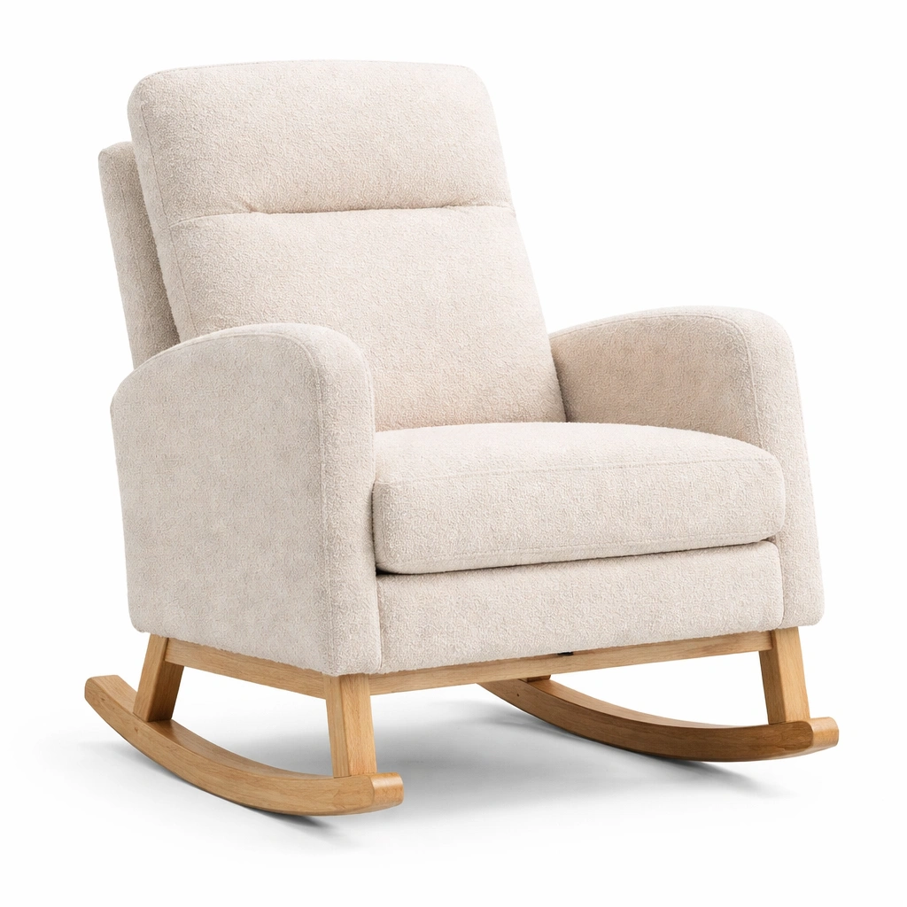 Estructura: Mecedora con marco sólido de madera y tapizado resistente.