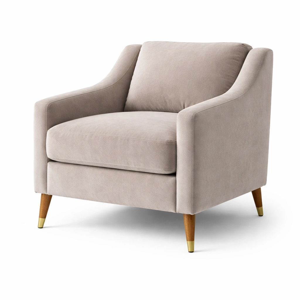 Sillón de terciopelo beige con patas de madera